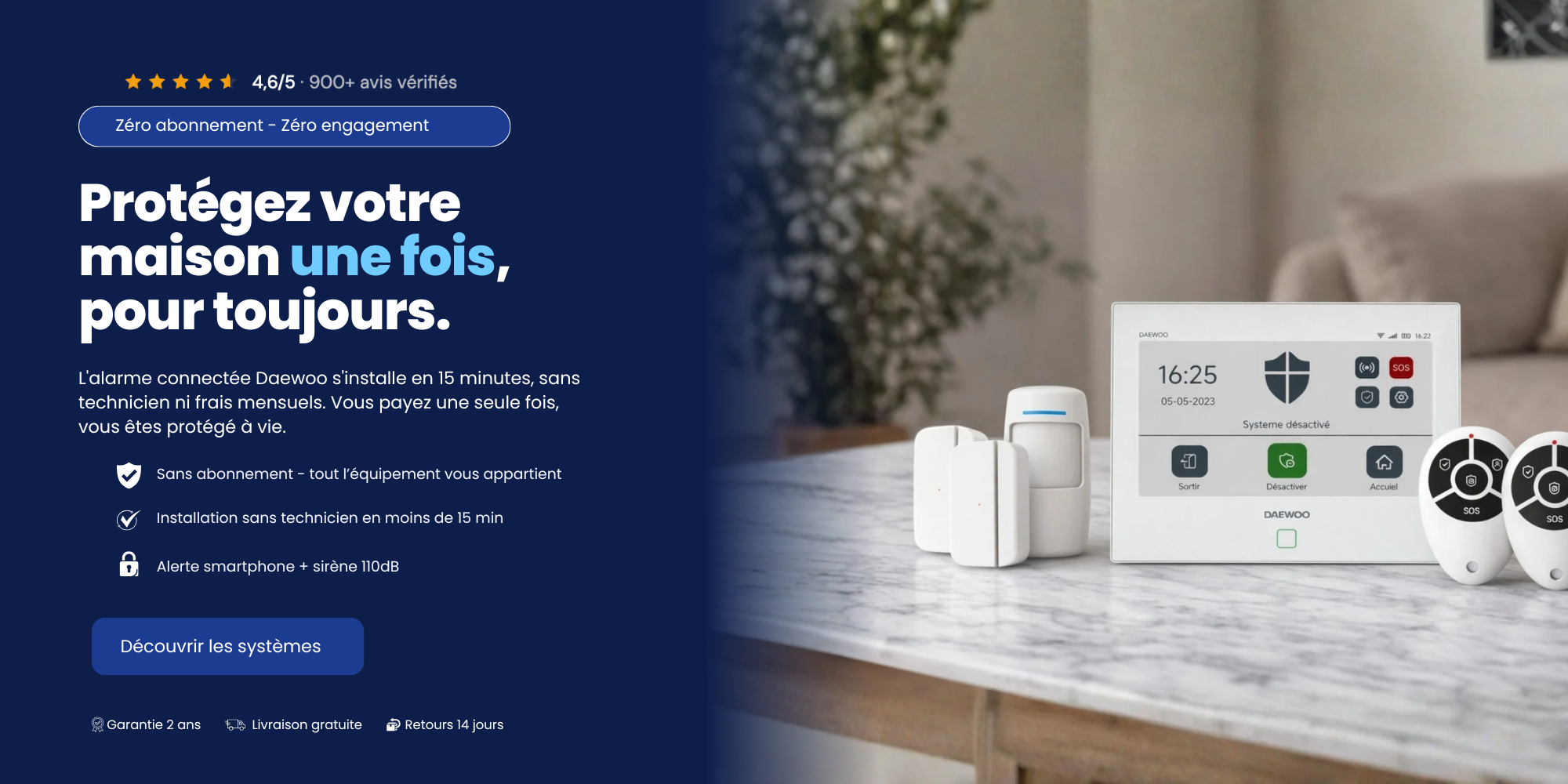 Daewoo Security simplifie la sécurité à la maison — sans câbles, sans technicien et sans abonnement.